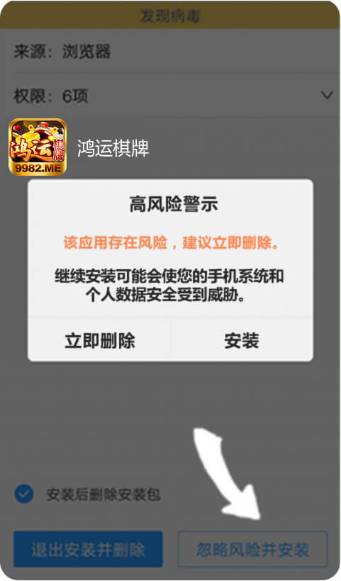 在「高风险提示」弹框出现后点击安装,如没有安装,请重复第一步并点击「忽略风险并安装」
